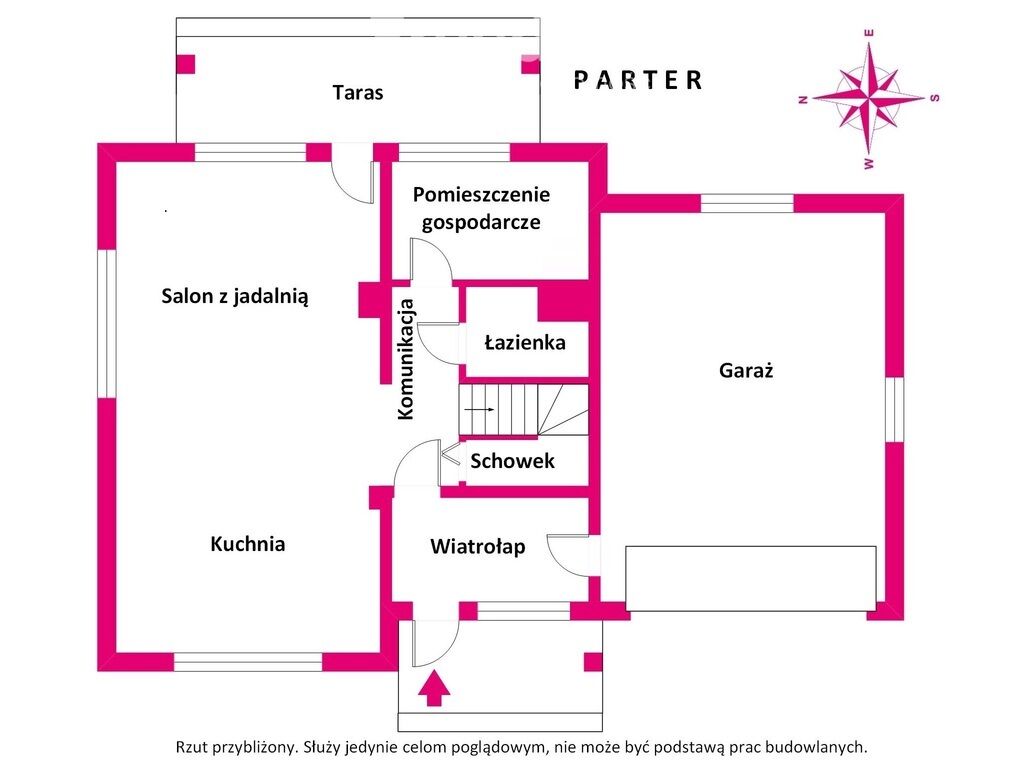 Na parterze czeka na Ciebie przestronny salon z kominkiem (30 m²)